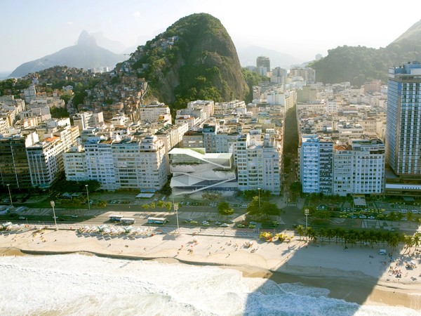 La arquitectura del museo se basa en la playa de Copacabana y su litoral, cercada por la construcción de una pared, sus montañas y su peculiar paseo diseñado por Roberto Burle Marx, que consistió en un patrón tradicional de la pavimentación portuguesa, utilizando ondas en piedra de color de blanco y negro en el conjunto.