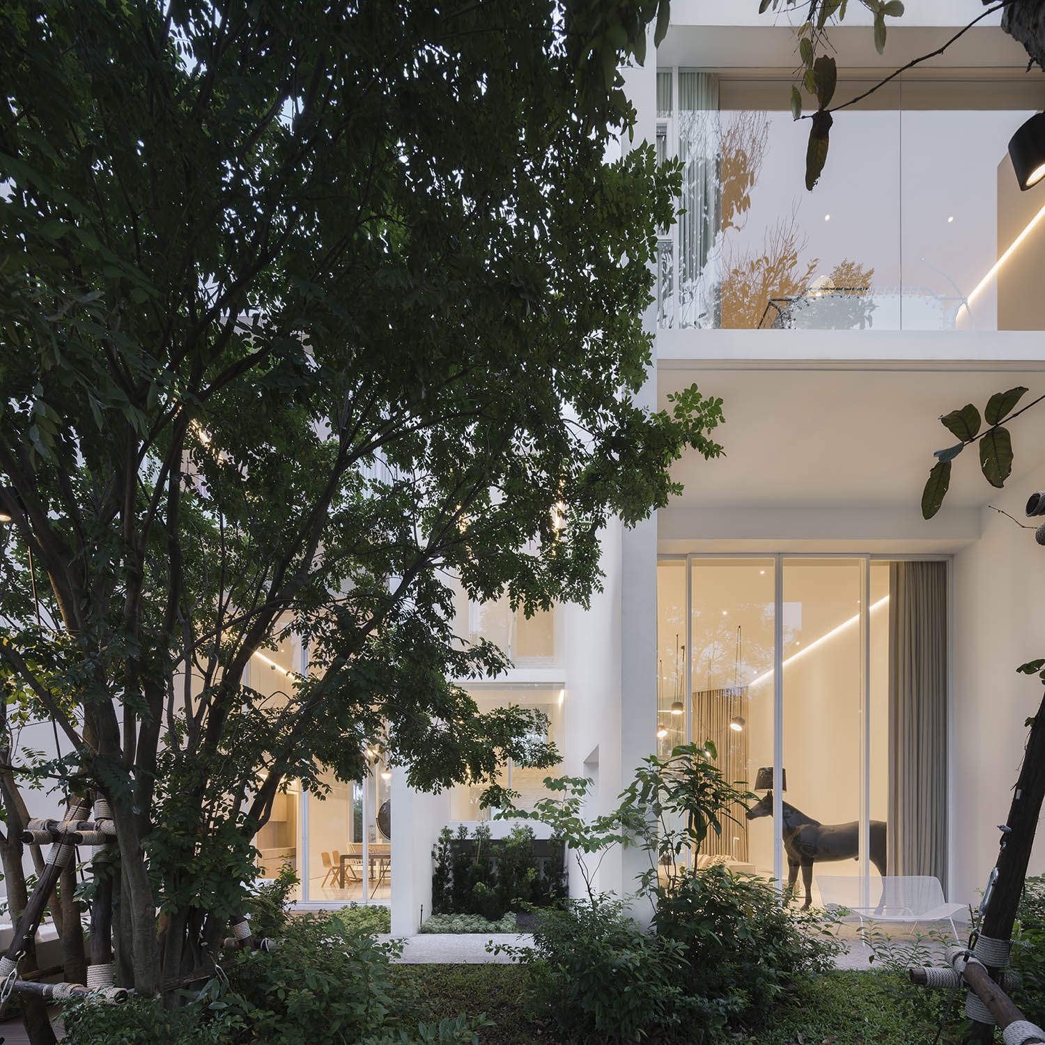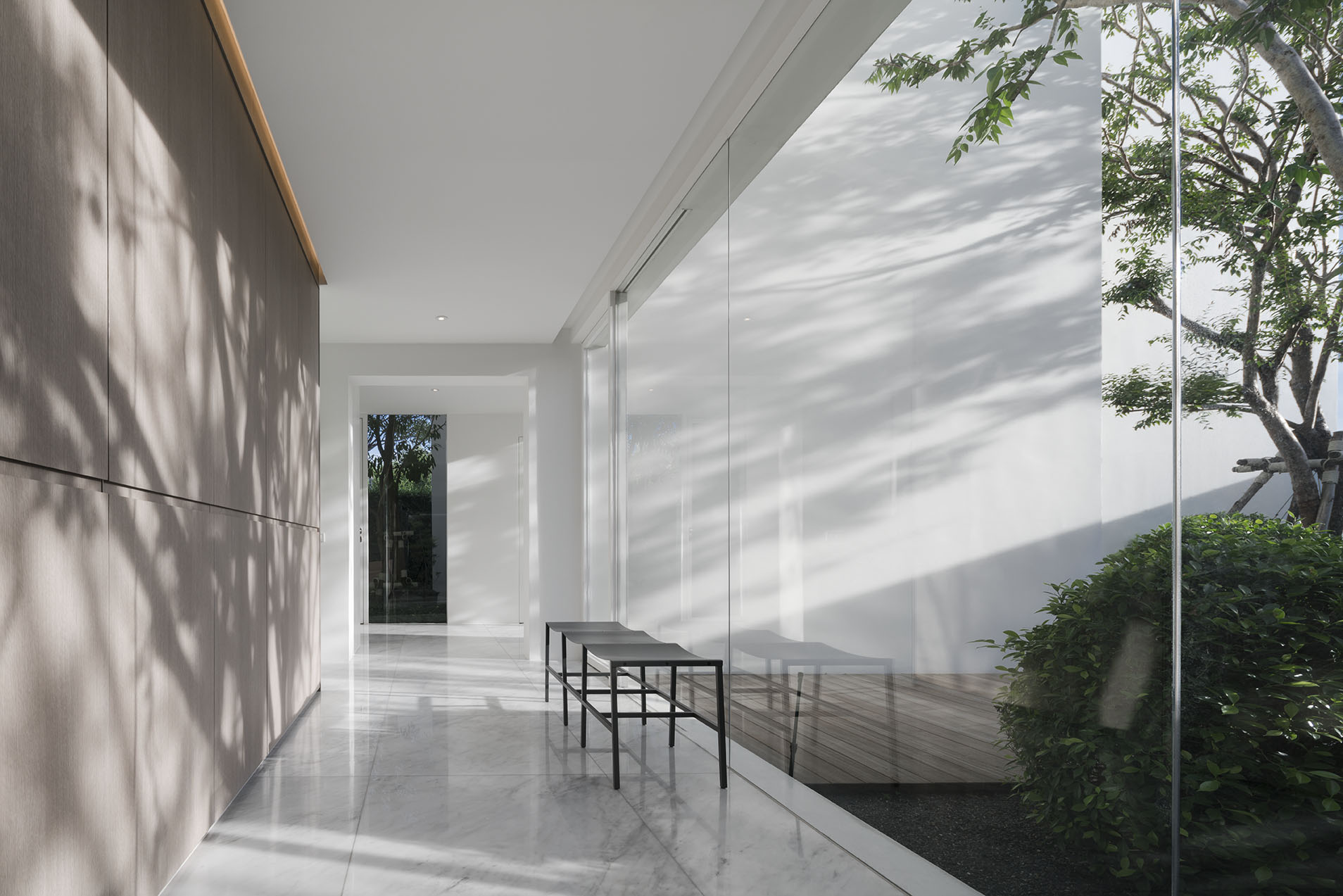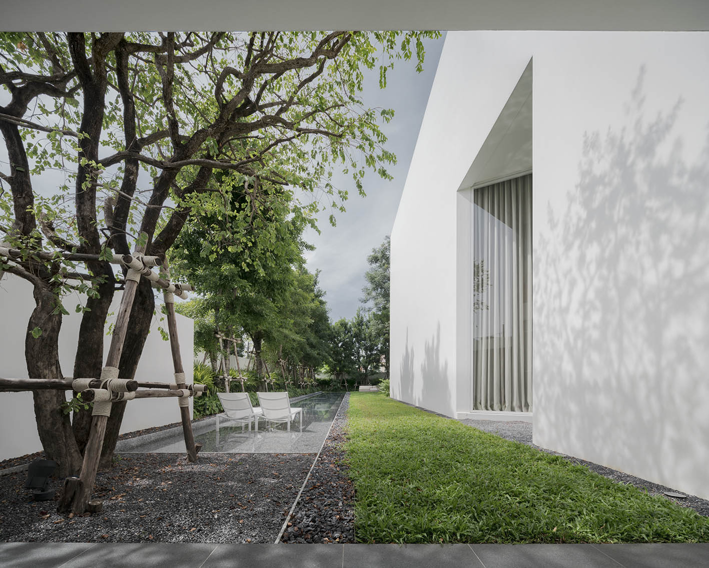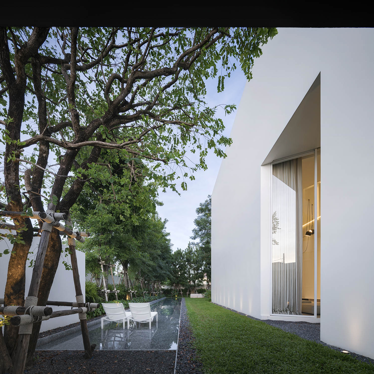 Esta casa está ubicada en Tailandia, país con climas bastante extremos, de modo que la disposición de sus patios y sus paredes blancas, ubicadas en el sentido Este-Oeste del proyecto, proporcionan un bloqueo a la fuerte radiación solar proveniente del Sur en las tardes. Esta vivienda se desarrolla en dos niveles principales y un entrepiso, con un doble volumen en la sala y el comedor. Las habitaciones están integradas entre las paredes exteriores de la casa y cuentan con ventanas con dos vistas hacia el jardín. Cuenta con dos salas de estudio: una para el propietario y otra para su esposa. Estas se encuentran ubicadas en la parte superior de un dormitorio para invitados y el baño principal.