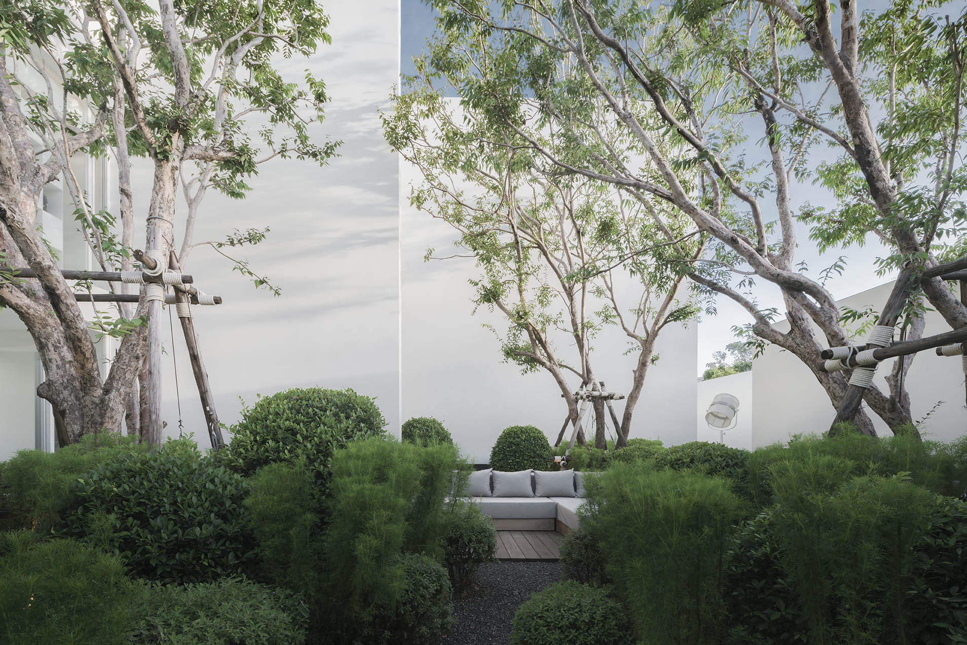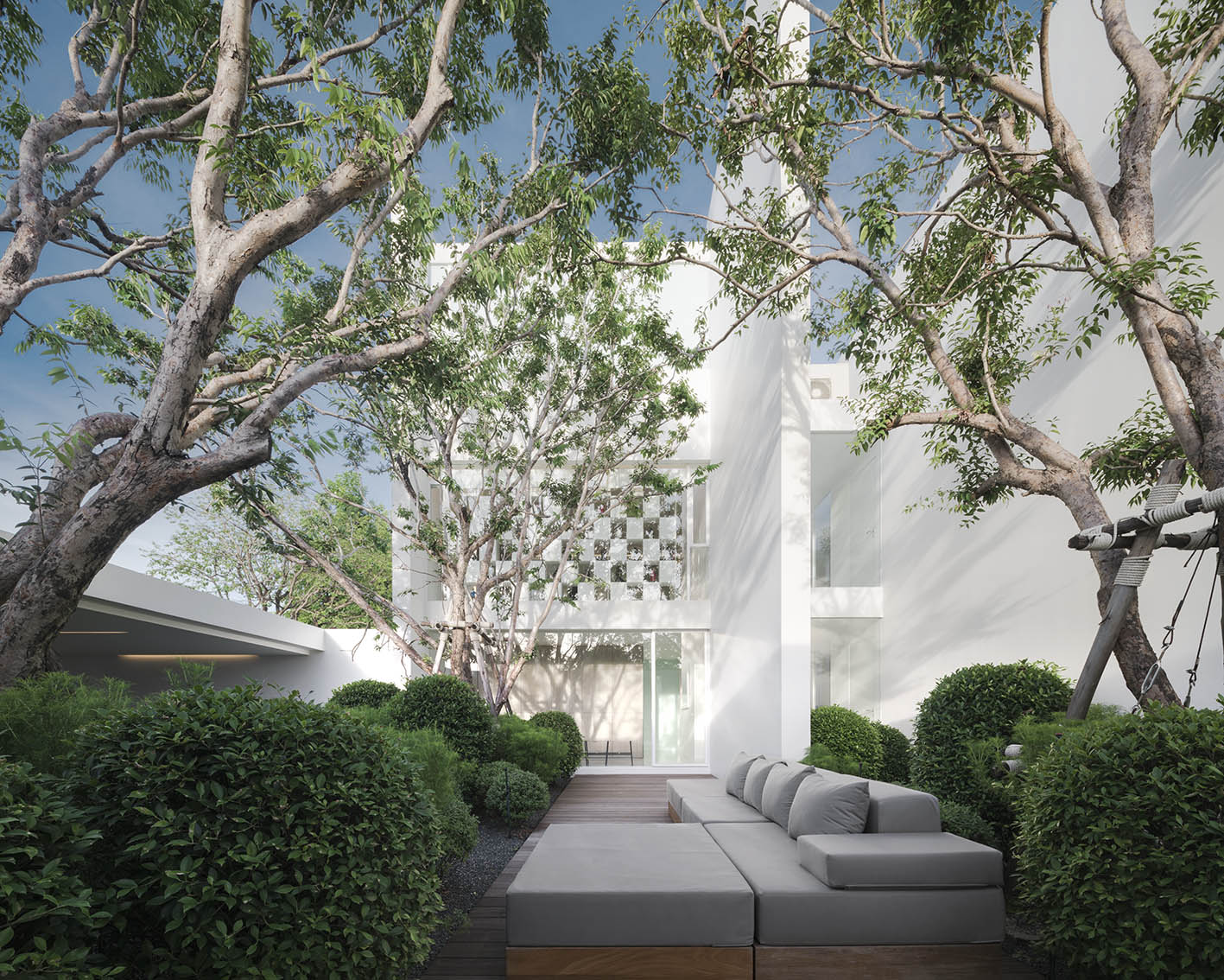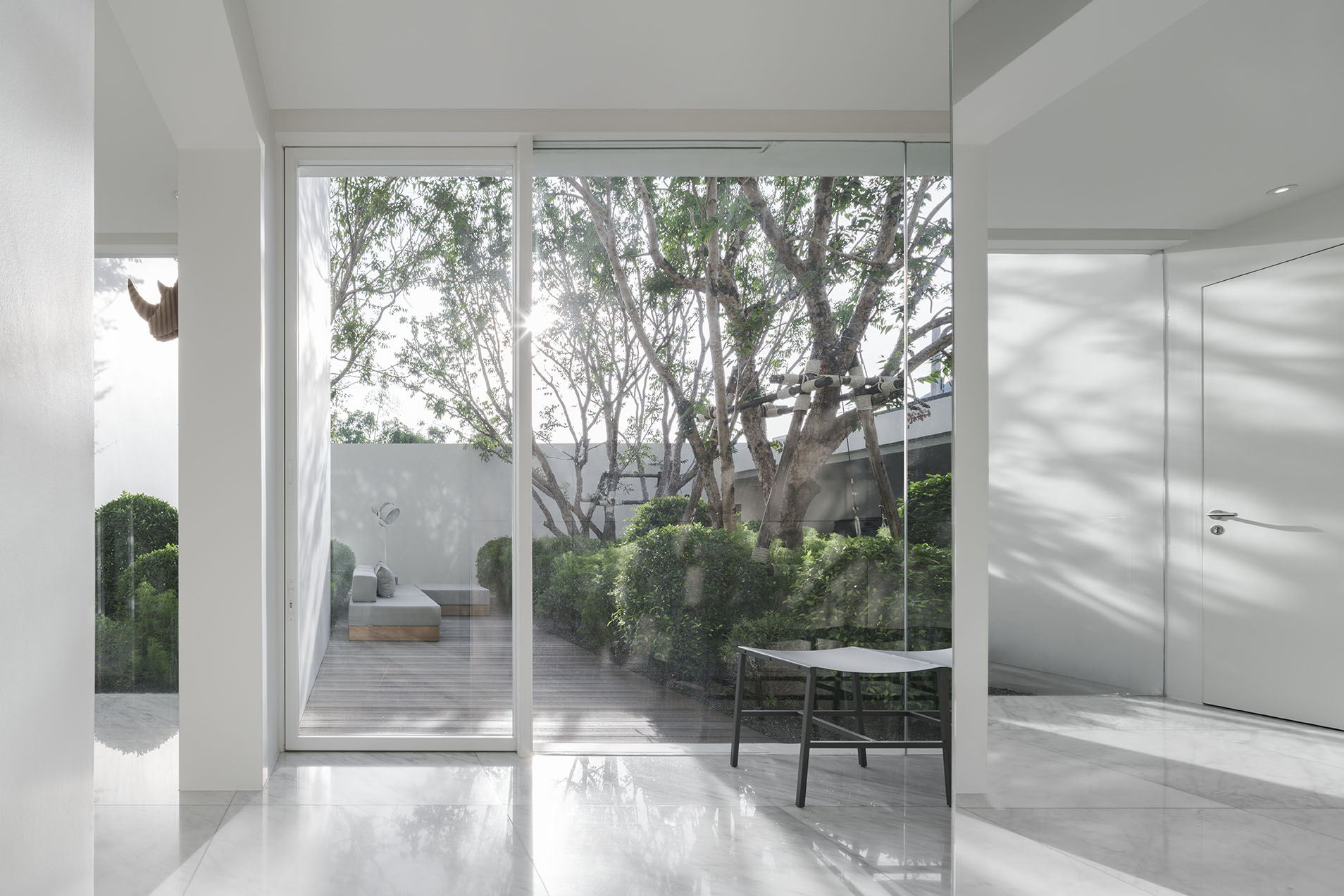Esta casa está ubicada en Tailandia, país con climas bastante extremos, de modo que la disposición de sus patios y sus paredes blancas, ubicadas en el sentido Este-Oeste del proyecto, proporcionan un bloqueo a la fuerte radiación solar proveniente del Sur en las tardes. Esta vivienda se desarrolla en dos niveles principales y un entrepiso, con un doble volumen en la sala y el comedor. Las habitaciones están integradas entre las paredes exteriores de la casa y cuentan con ventanas con dos vistas hacia el jardín. Cuenta con dos salas de estudio: una para el propietario y otra para su esposa. Estas se encuentran ubicadas en la parte superior de un dormitorio para invitados y el baño principal.