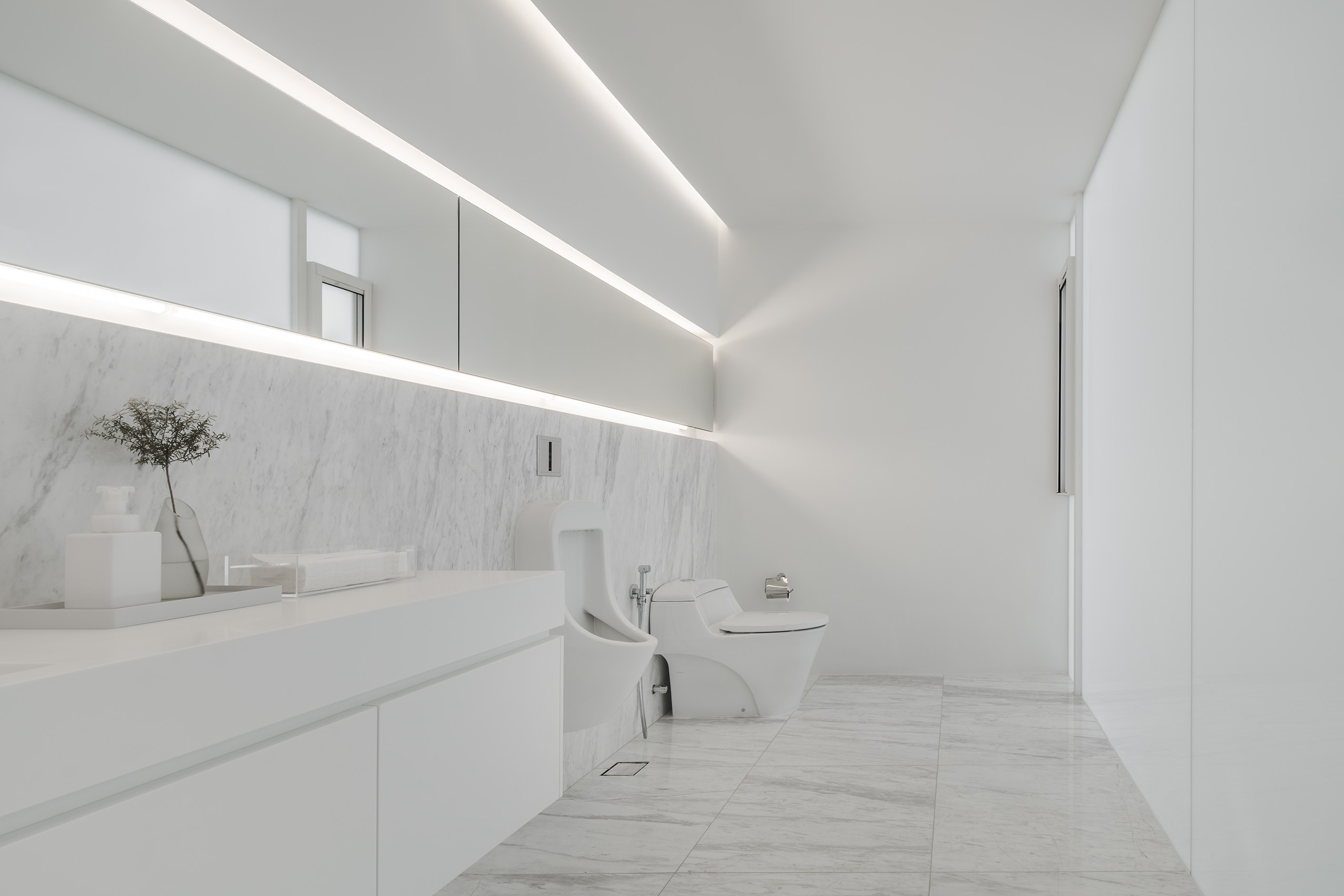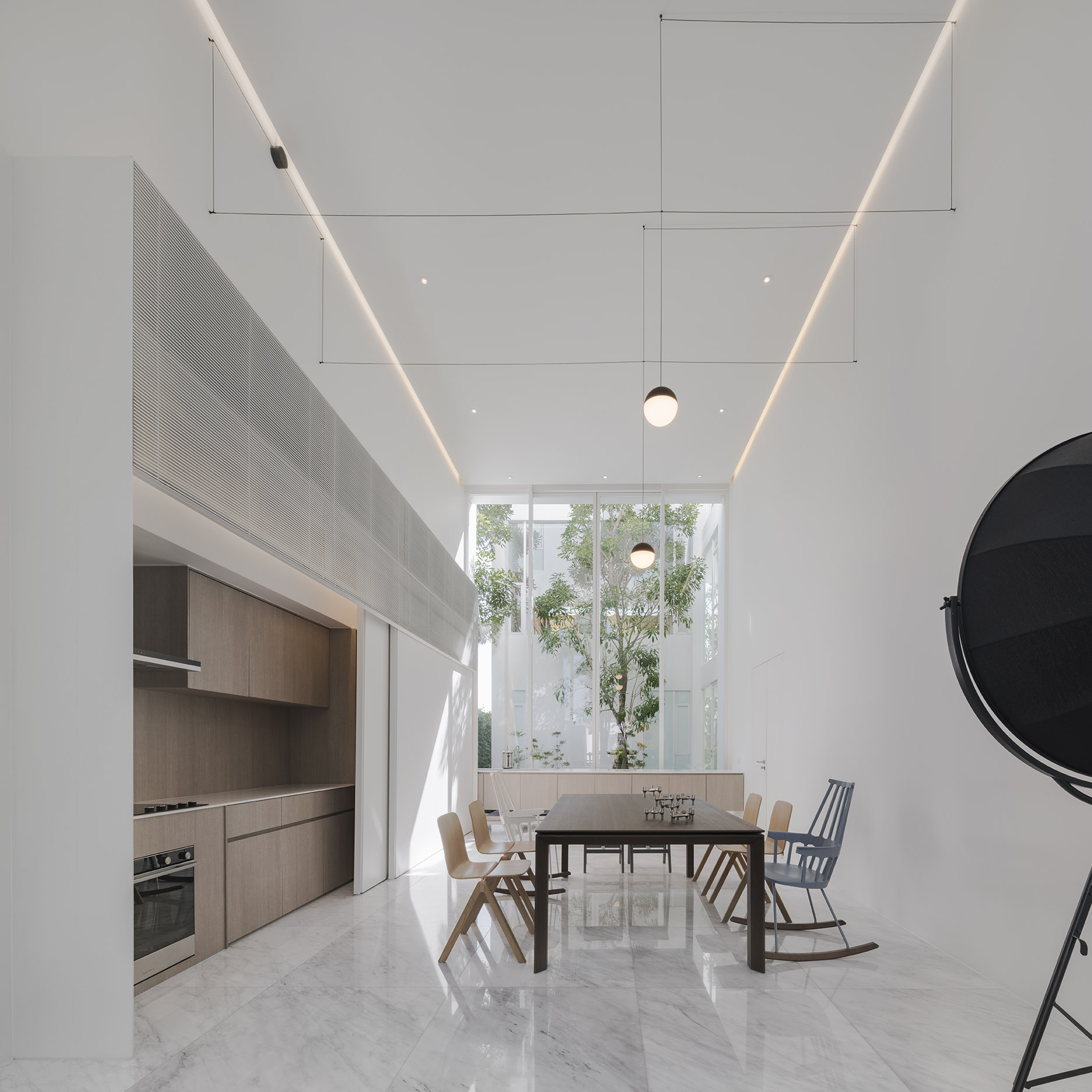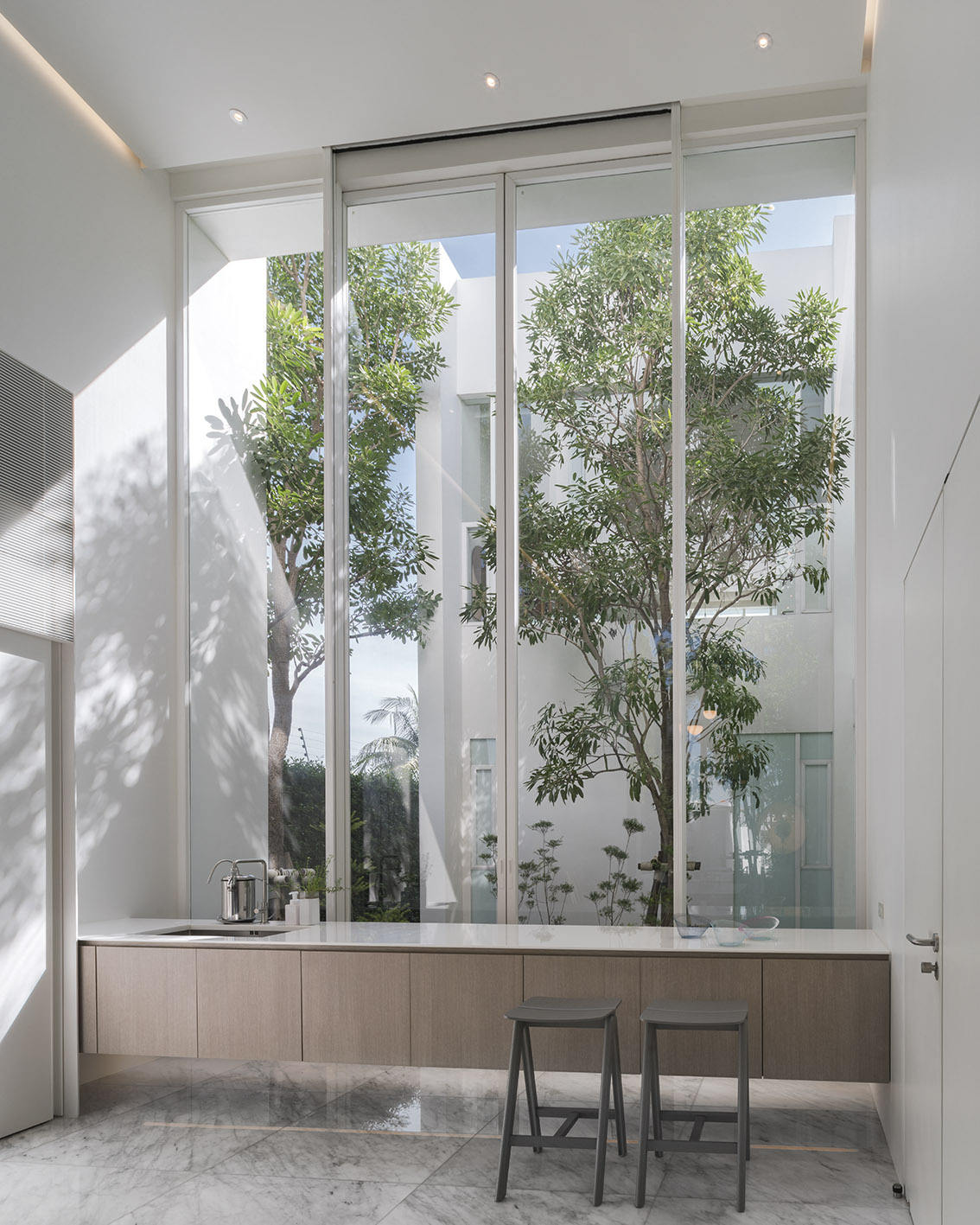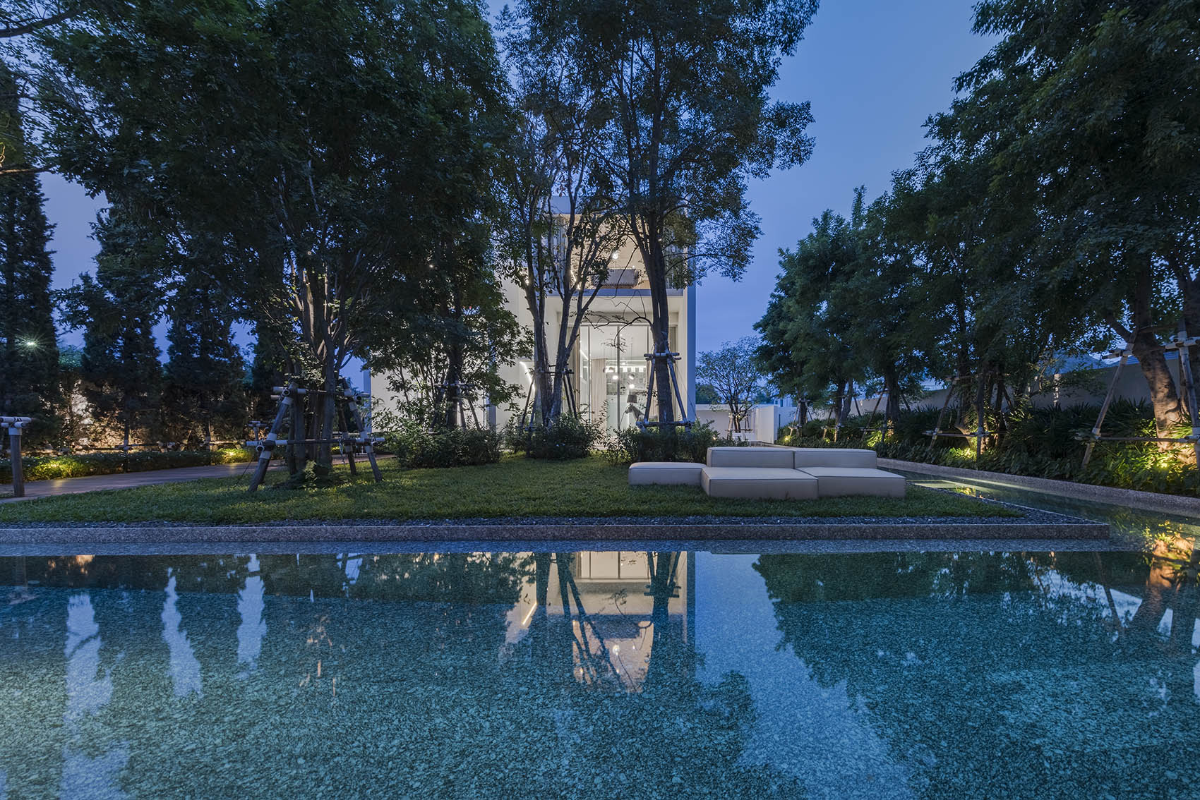 Esta casa está ubicada en Tailandia, país con climas bastante extremos, de modo que la disposición de sus patios y sus paredes blancas, ubicadas en el sentido Este-Oeste del proyecto, proporcionan un bloqueo a la fuerte radiación solar proveniente del Sur en las tardes. Esta vivienda se desarrolla en dos niveles principales y un entrepiso, con un doble volumen en la sala y el comedor. Las habitaciones están integradas entre las paredes exteriores de la casa y cuentan con ventanas con dos vistas hacia el jardín. Cuenta con dos salas de estudio: una para el propietario y otra para su esposa. Estas se encuentran ubicadas en la parte superior de un dormitorio para invitados y el baño principal.